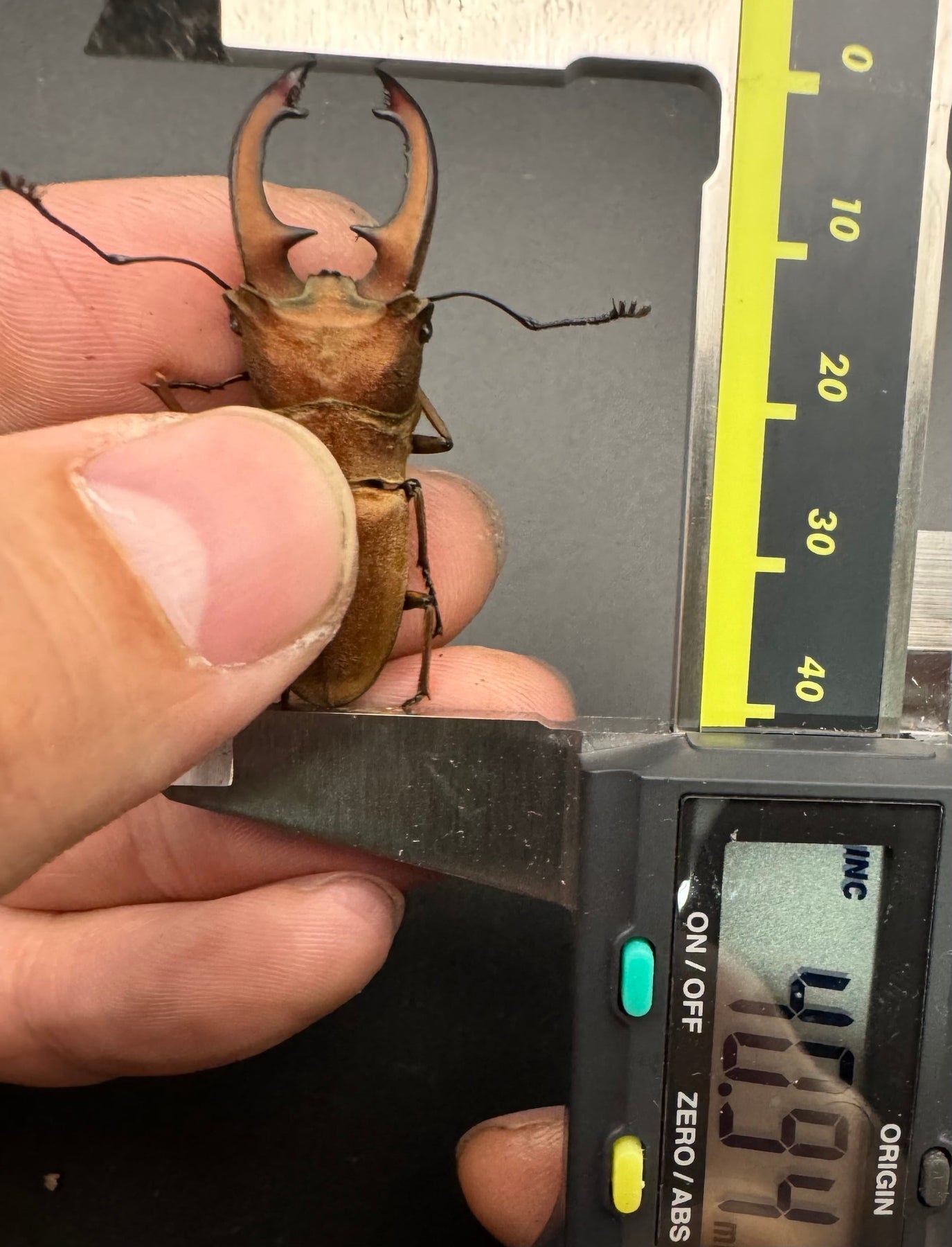 この個体はミツトヨのデキタルノギスで40.8-40.9mmと計測はとれましたが、